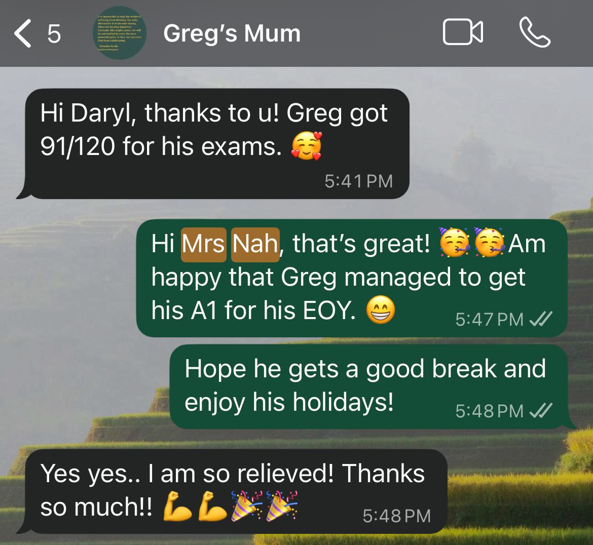 Mr Daryl has patiently taught me through the years in secondary school. He teaches me through the understanding of the concepts and helped me gain confidence in the subject. He is always open to me asking him questions, during lesson and out of lesson. I have recommended my friend to him, and both of us managed to get an A for O levels!