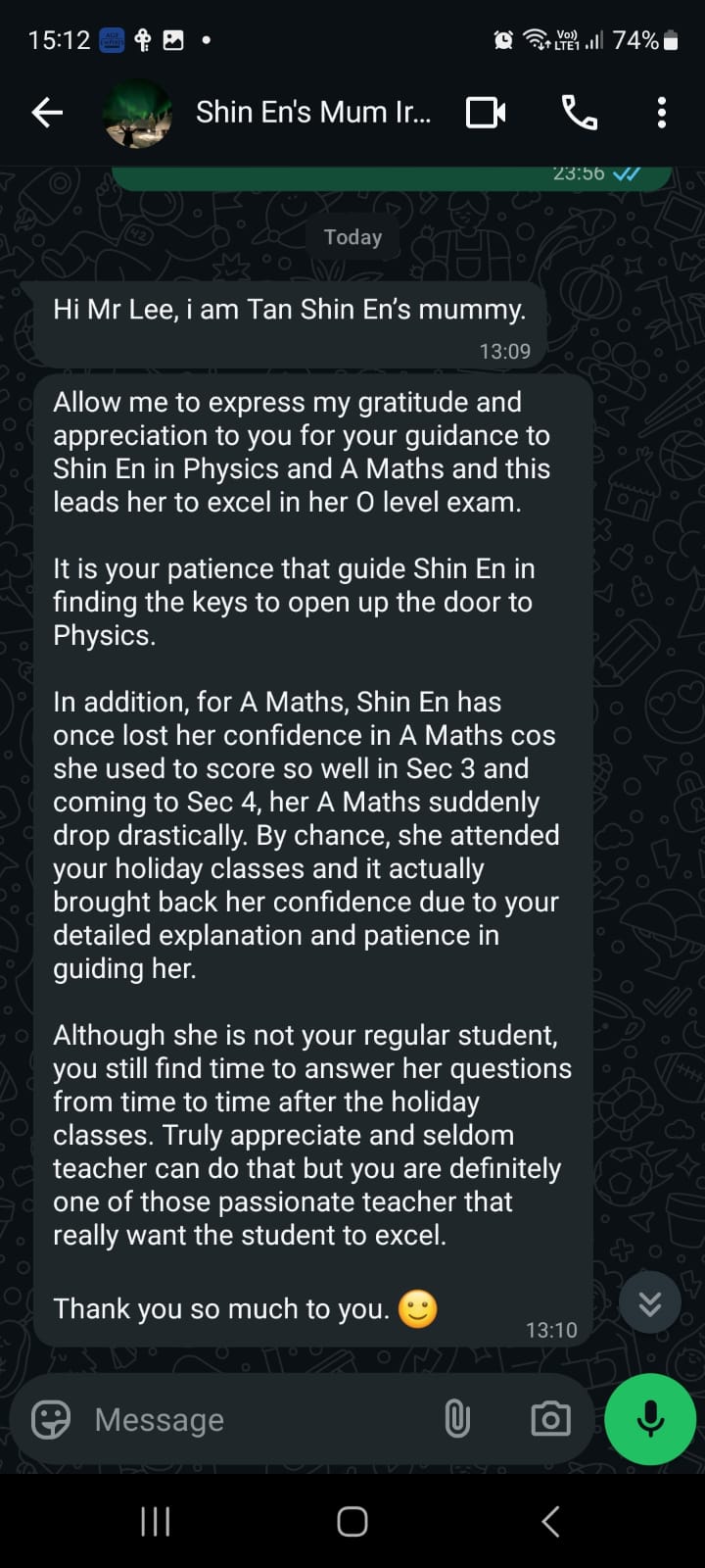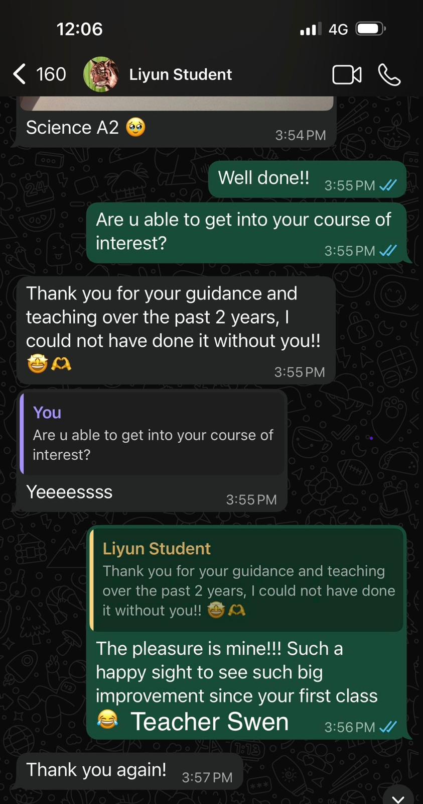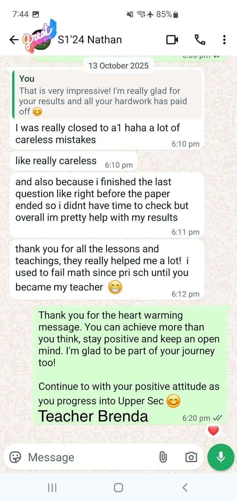 Thanks to her patient guidance and dedication, Emma went into her PSLE feeling ready and assured. We’re so thankful to have had such a passionate and caring teacher! Highly recommended to any parent looking for a teacher who genuinely brings out the best in their child.
